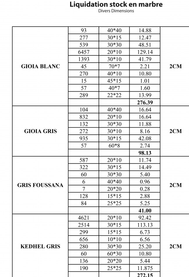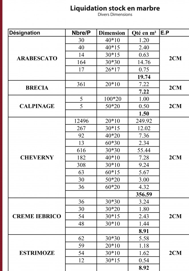 vous trouverez ci dessous différents type de marbre avec differents mesures , PRIX EXCEPTIONNEL