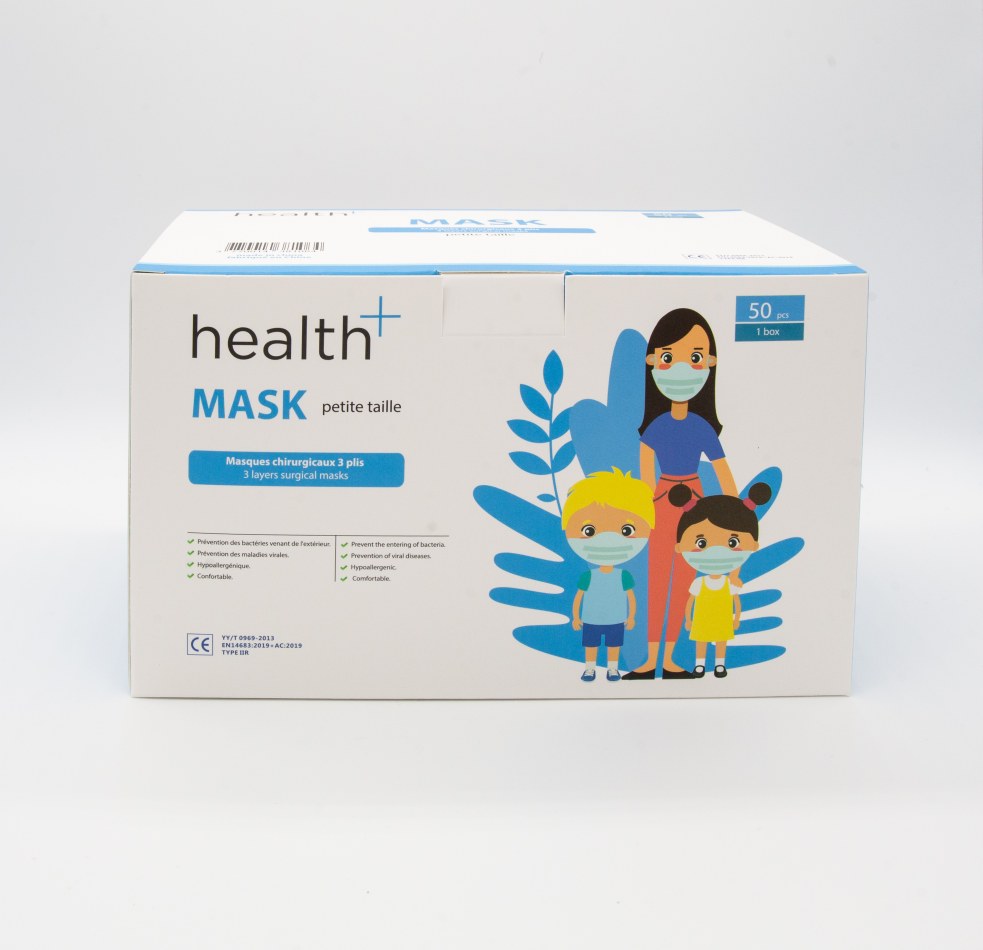 Masques PETITE TAILLE médicaux/ chirurgicaux EN 14683 type II R. Boite de 50 masques en 5 sachets de 10. Norme CE & FDA. Filtration EFB>98%. 3 plis. 3 couches. Hypoallergénique. Infos, notice en Français sur la boite