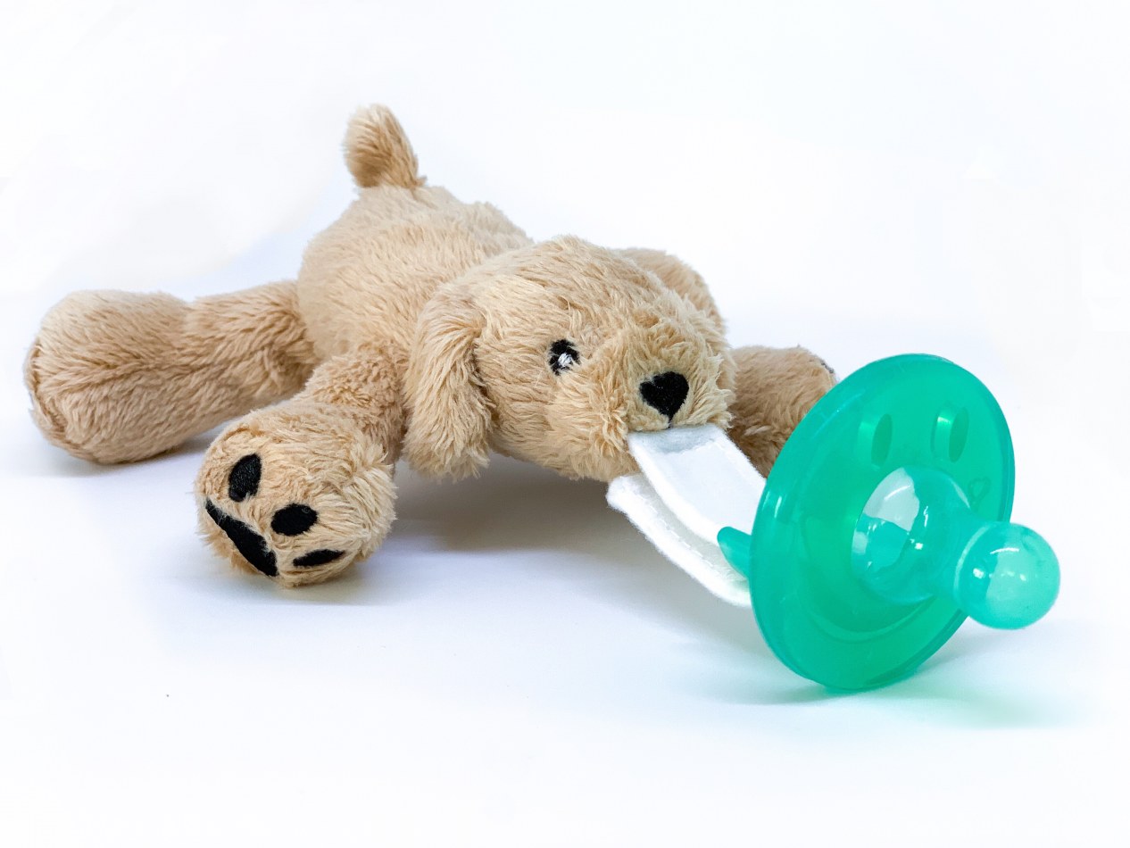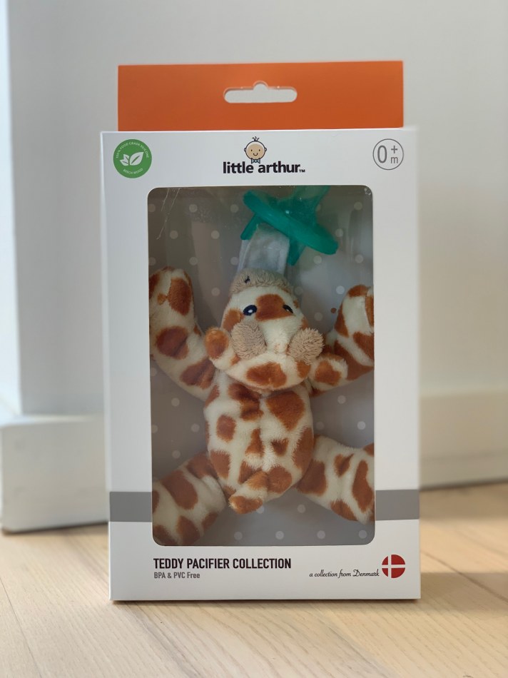 Liquidation d'un lot de 498 peluche-tétines dans trois modèles différenttes (chiot, lapin et giraf) de la marque danoise "Little Arthur". Produit innovant pour bébé : la tétine-peluche offre une conception unique permettant de détacher la tétine afin de faciliter son nettoyage. Cette création est réalisée avec une sucette orthodontique en silicone de qualité médicale, sans latex, sans bisphénol A et sans résine phtalique. Le prix de vente sur Amazon en France est de 20,99 € TTC (hors frais de livraison).