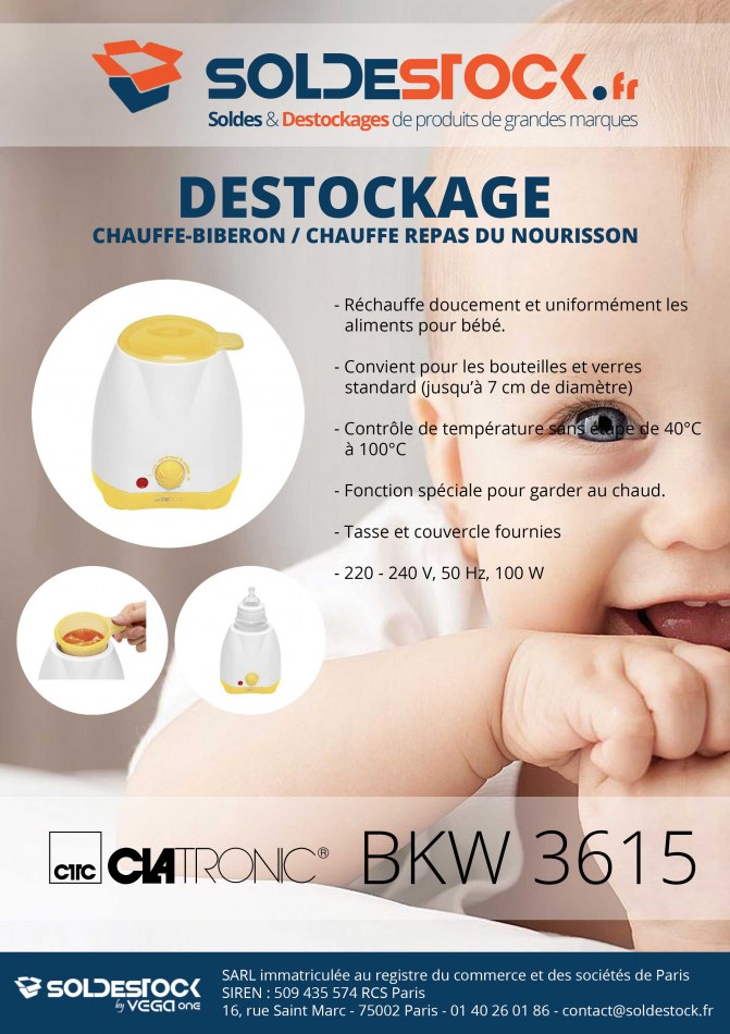 Le CLATRONIC BKW 3615 est un chauffe-plat et un chauffe biberon pour bébé. Très polyvalent le CLATRONIC BKW 3615 réchauffe doucement et uniformément les aliments de votre bébé. Le chauffe-plat CLATRONIC BKW 3615 est très polyvalent car il peut recevoir des biberons, des bouteilles, des verres et des contenant jusqu'à 7cm de diamètre.