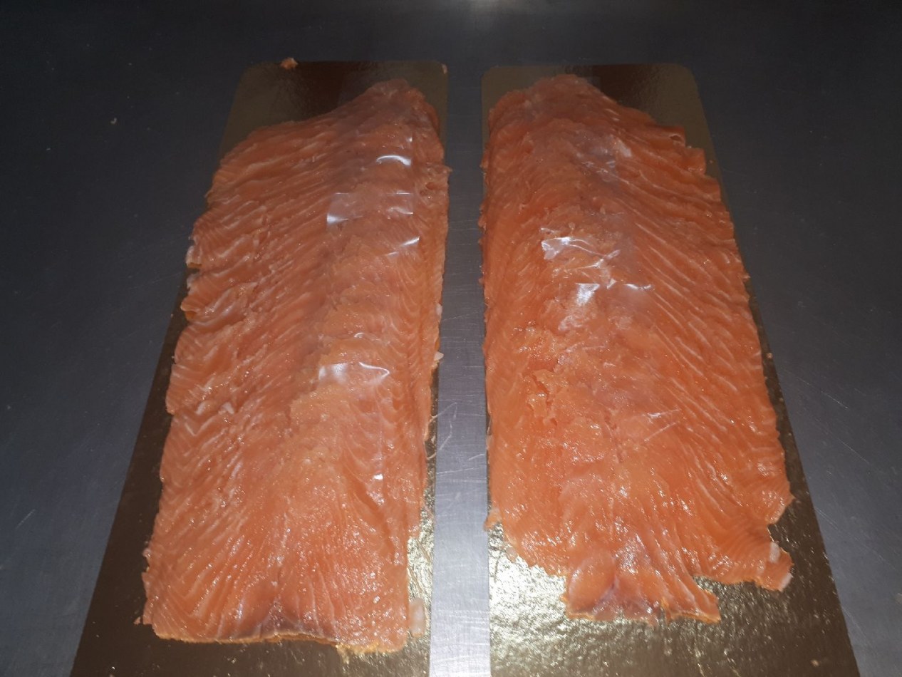 BANDE DE SAUMON FUME PRETRANCHE sans peau sans arête avec intercalaire.