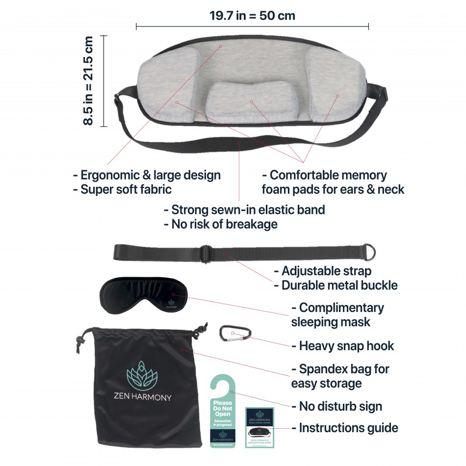 Design ergonomique, tissu extra doux, confortables coussinets en mousse à mémoire de forme, bande élastique cousue (pas de risque de rupture), sangle ajustable, masque de nuit offert, livré dans son sac de rangement.
