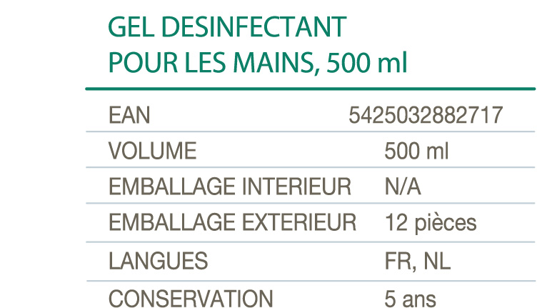 Le gel élimine 99,99% des bactéries. Testé dematologiquement. Ingrédients actifs : 70% éthanol (CAS64-17-5), aloe vera, biocideet produit virucide destiné à l'hygiène humaine TP1. Les enfants de moins de 6 ans peuvent utiliser le produit sous surveillance.