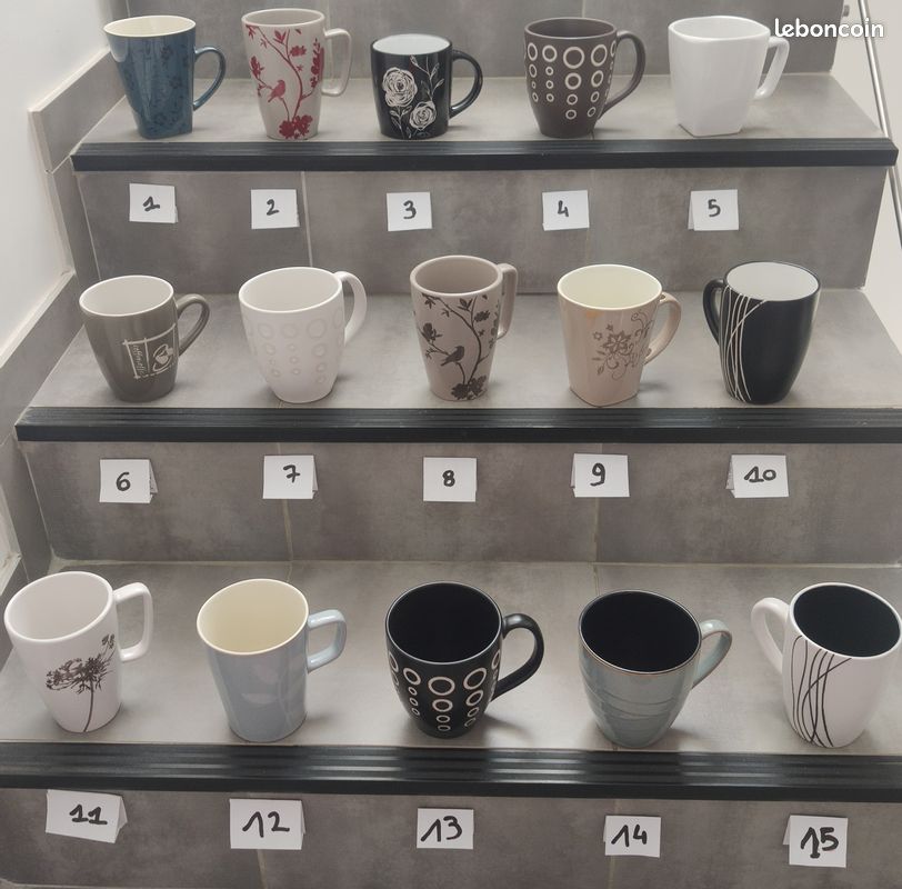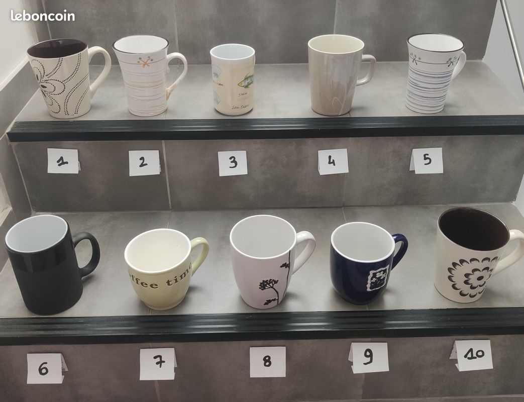 BONJOUR JE VOUS PROPOSE UN LOT DE MUG TASSE CHOP A CAFE OU CHOCOLAT CHAUD TRES MODERNE ET DE QUALITE.