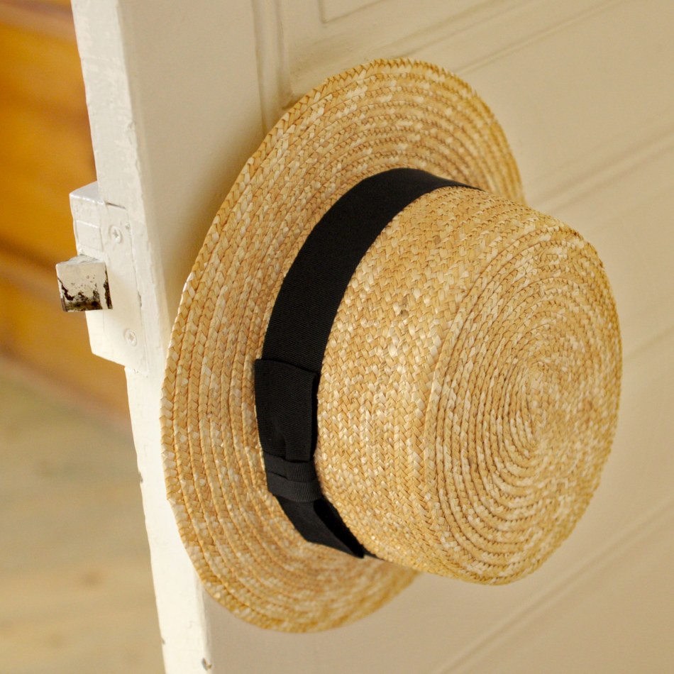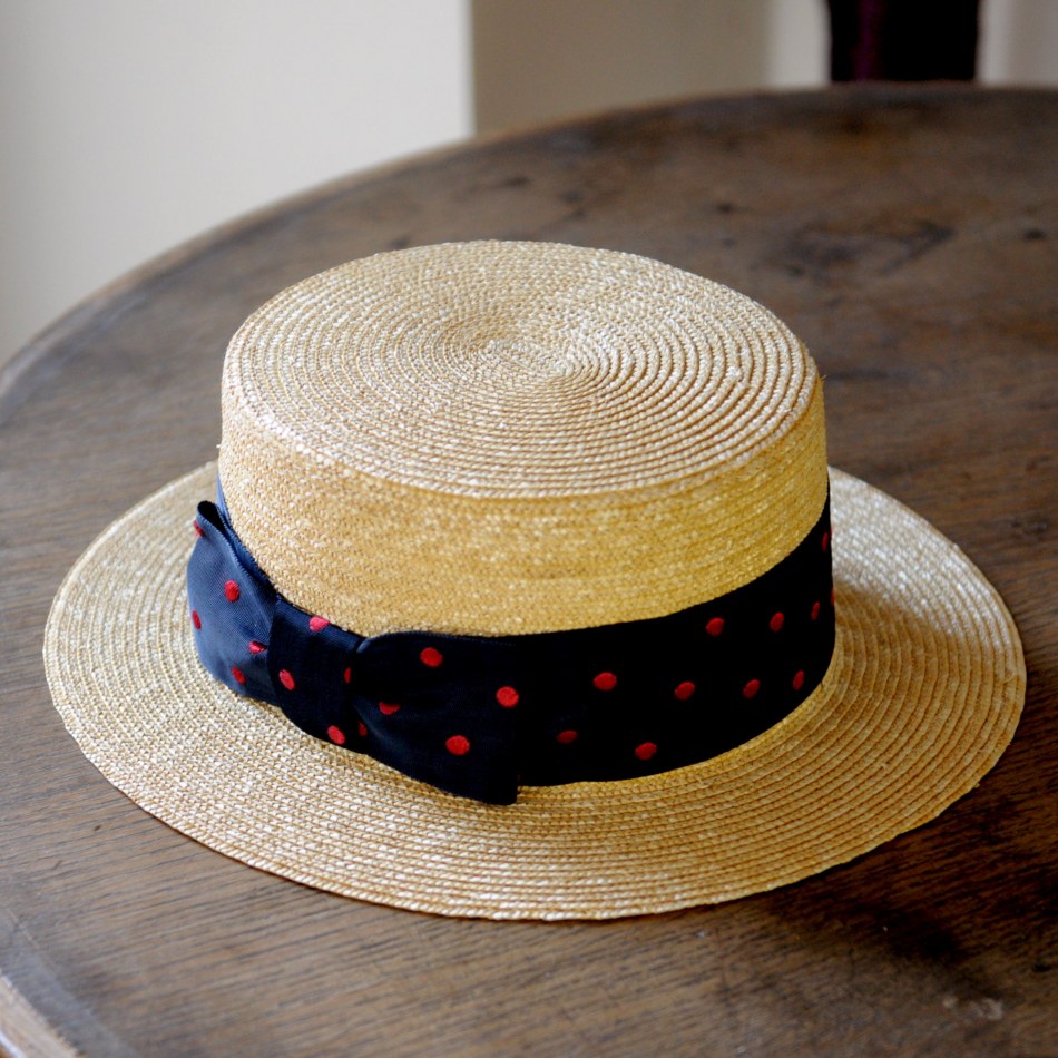 Fabricant français de Caussade (Willy's Paris). Canotiers traditionnels (6 canotiers allant de la taille 57 à la taille 61) et de luxe - rubans anciens et paille fine (10 chapeaux allant de la taille 56 à 61), pochettes en paille demi-lune (6).