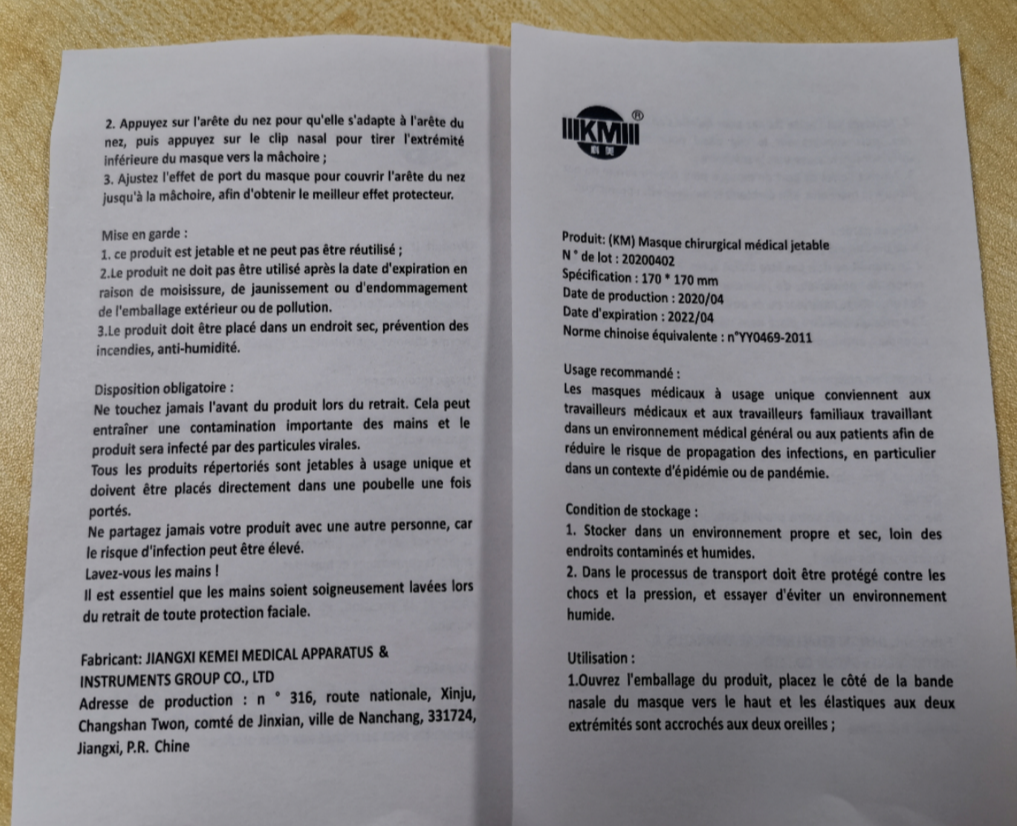 Pour cause de fin du contrat de location d'entrepot, à saisir en urgence lot de masques chirurgicaux norme chinoise YY0469-2011, qui correspond à la législation européenne pour les masques à usage médical de type I.
