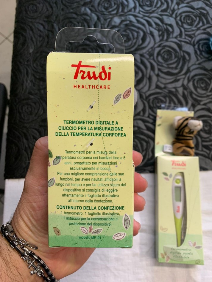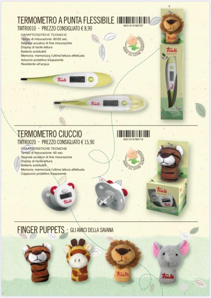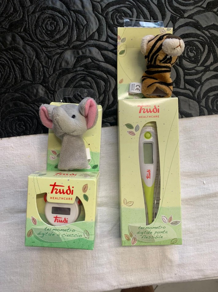 Thermomètres Trudi, prix de vente 5 euros par pièce. Disponible environ 1000 sucettes (pack bas) et environ 3000 embouts flexibles (pack haut)