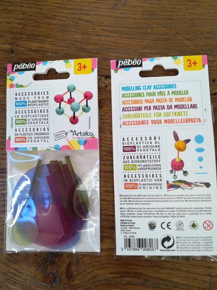 Sachet de 20 pièces de bio plastique (plastique végétal 100% naturel colorés aux pigments végétaux) pour jouer avec la pâte à modeler. (prix public 5.90€). Vendus sous la marque Pébéo