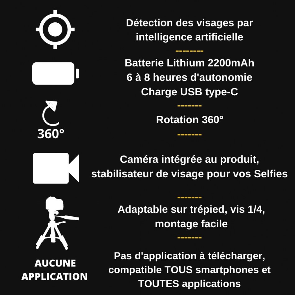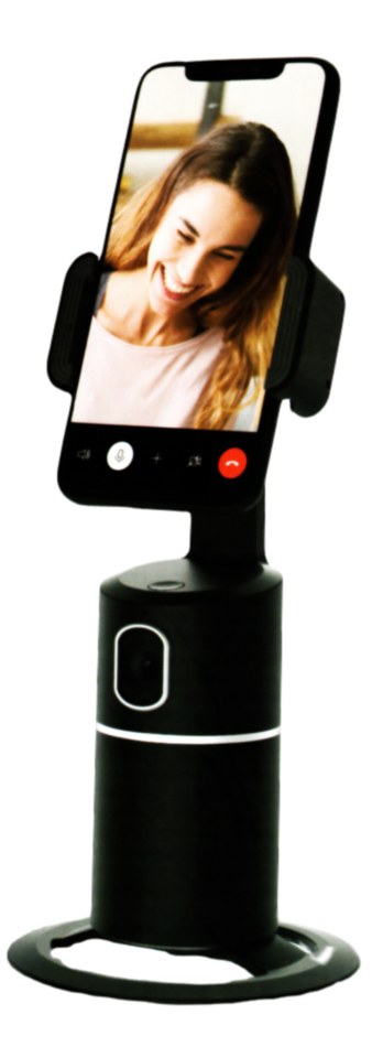 Support rotatif pour smartphone. Grâce à sa caméra intégrée et son intelligence artificielle, ce support est à même de détecter votre visage et suivre vos mouvements en temps réel.