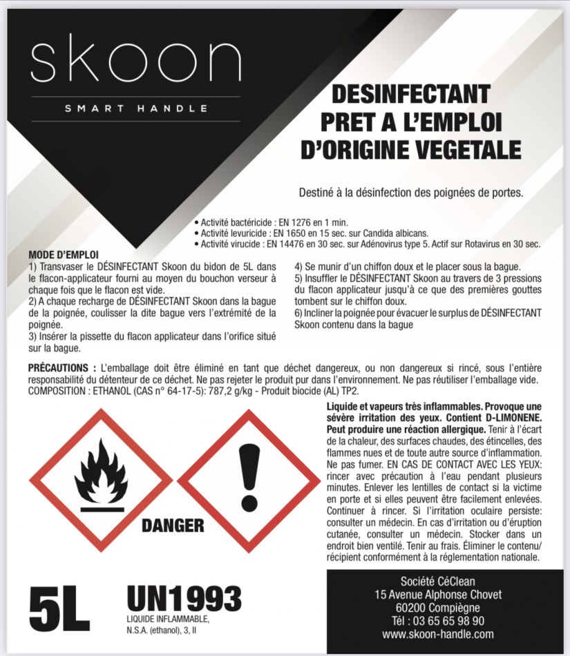 La société CéClean déstocke 256 bidons de 5L de son liquide détergeant / désinfectant fabriqué en France et répondant aux caractéristiques suivantes :