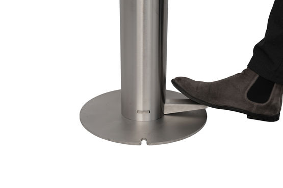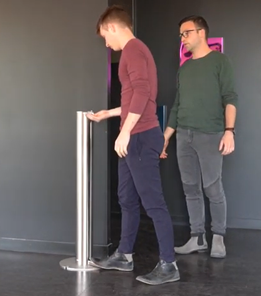 l suffit d'appuyer avec le pied sur la pédale au sol et le gel hydroalcoolique coule dans la main, c'est simple et sans contact