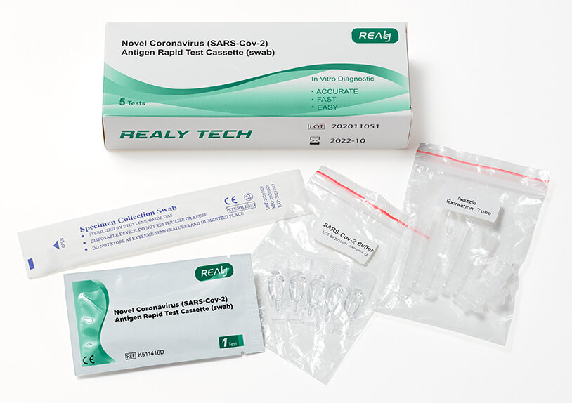 Vend auto nasal test realy tech en boite de 5 unités. Colis de 500 unités. Colis à 1350 € soit 2,70 € le test.