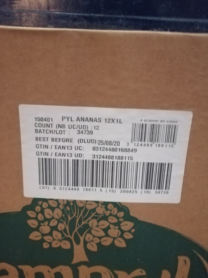 - Ananas : environ 180 bouteilles, DLUO: 01.07.20