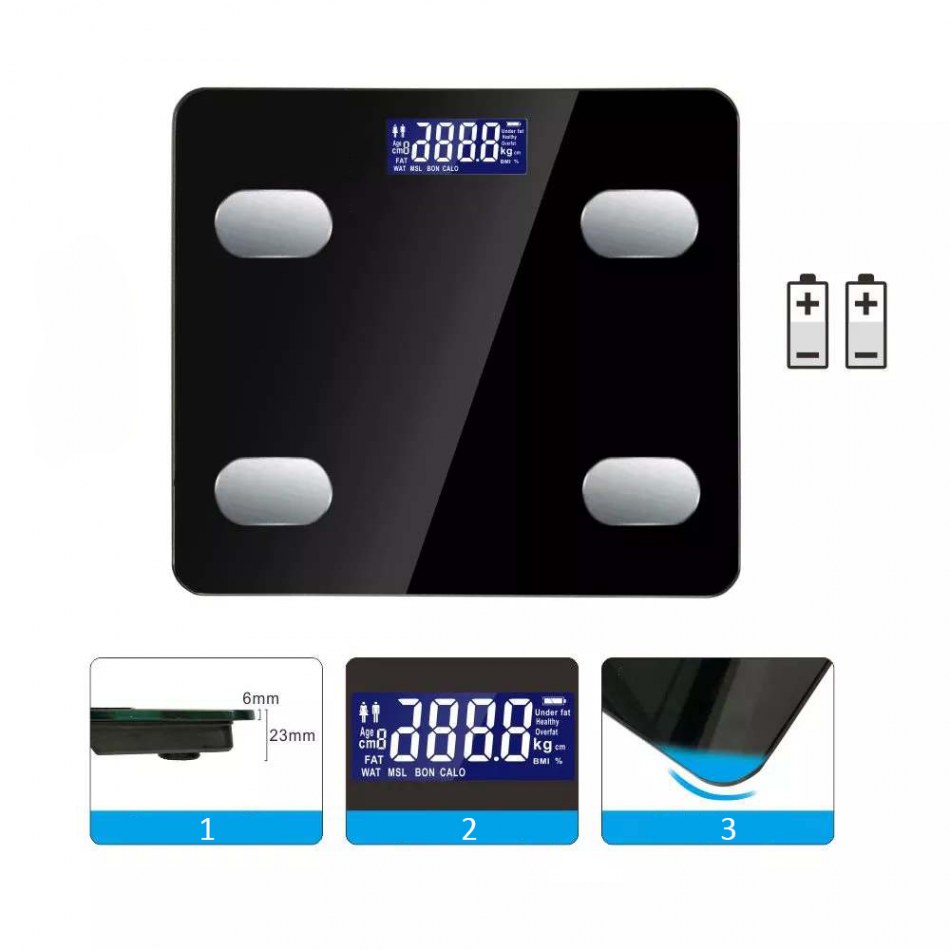 Fonctions de mesure: poids corporel, graisse corporelle, teneur en eau (en%), masse musculaire (en%), masse osseuse (en kg), apport calorique quotidien (indice BMR), valeur IMC (indice de masse corporelle).