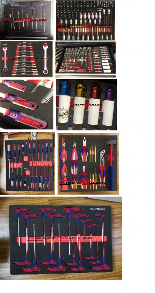 Cette servante d'atelier se compose de 7 tiroirs pleins d'outils de qualité professionnelle : 419 pièces de la marque de renommée allemande Kraft Müller, rangées par types et par tailles dans des compartiments en mousse Eva :