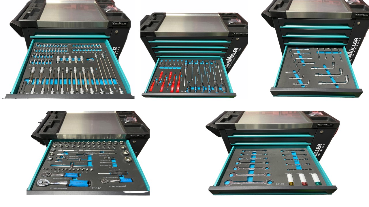 5 des 7 tiroirs sont largement équipés d'outils de haute qualité. Grâce aux entrées détagère, chaque outil a sa propre place. Ainsi, chaque pièce est trouvée rapidement et peut être rangée de manière professionnelle et sûre. Lors de la fermeture, les tiroirs se verrouillent afin de ne pas souvrir par mégarde lors de déplacements. Un cadenas permet de verrouiller le chariot d´atelier et protège vos outils contre tout accès non autorisé.