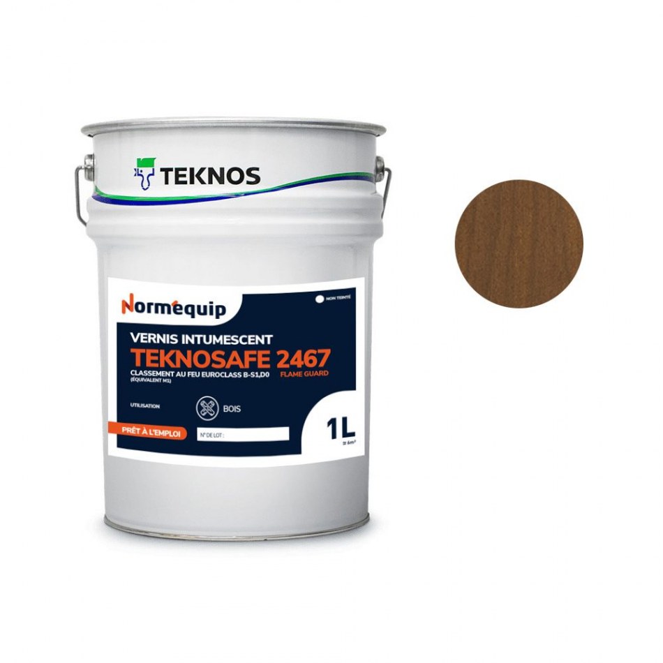 Le Teknos Teknosafe 2467 est un vernis intumescent pour bois et dérivés de bois en intérieur et extérieur sous abri. Ce vernis conçu à base d'eau permet un classement de réaction au feu B-s1;d0 ou M1 sur tout support de bois brut raboté ou panneaux à base de bois ayant une épaisseur supérieure à 8 mm et une densité supérieure à 338 kg/m3, pour cela il est nécessaire d'appliquer 200g/m² + ou - 10% de vernis (1 litre permet de traiter 6m²).