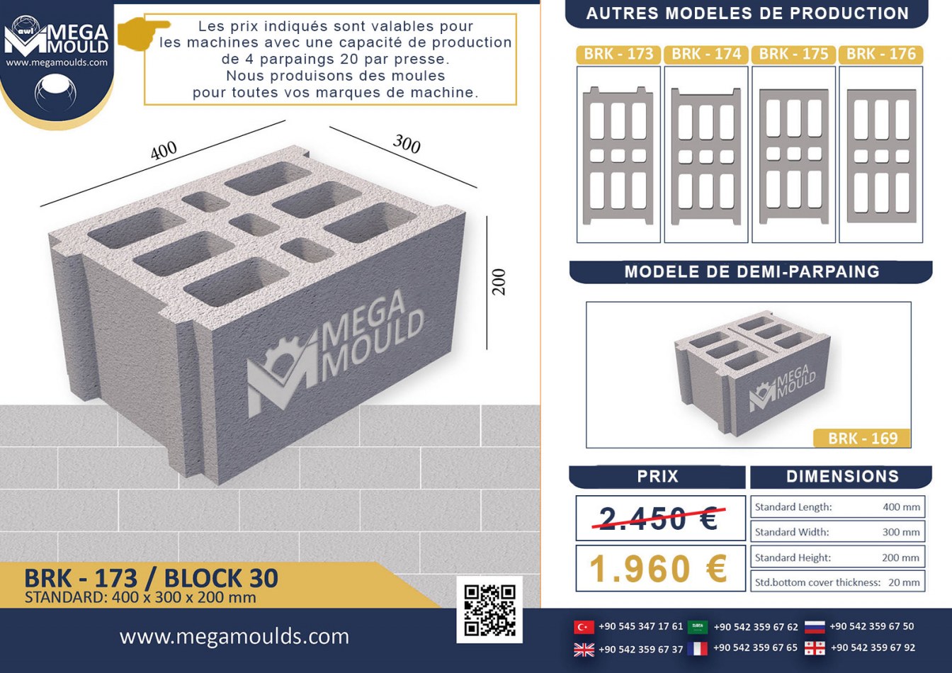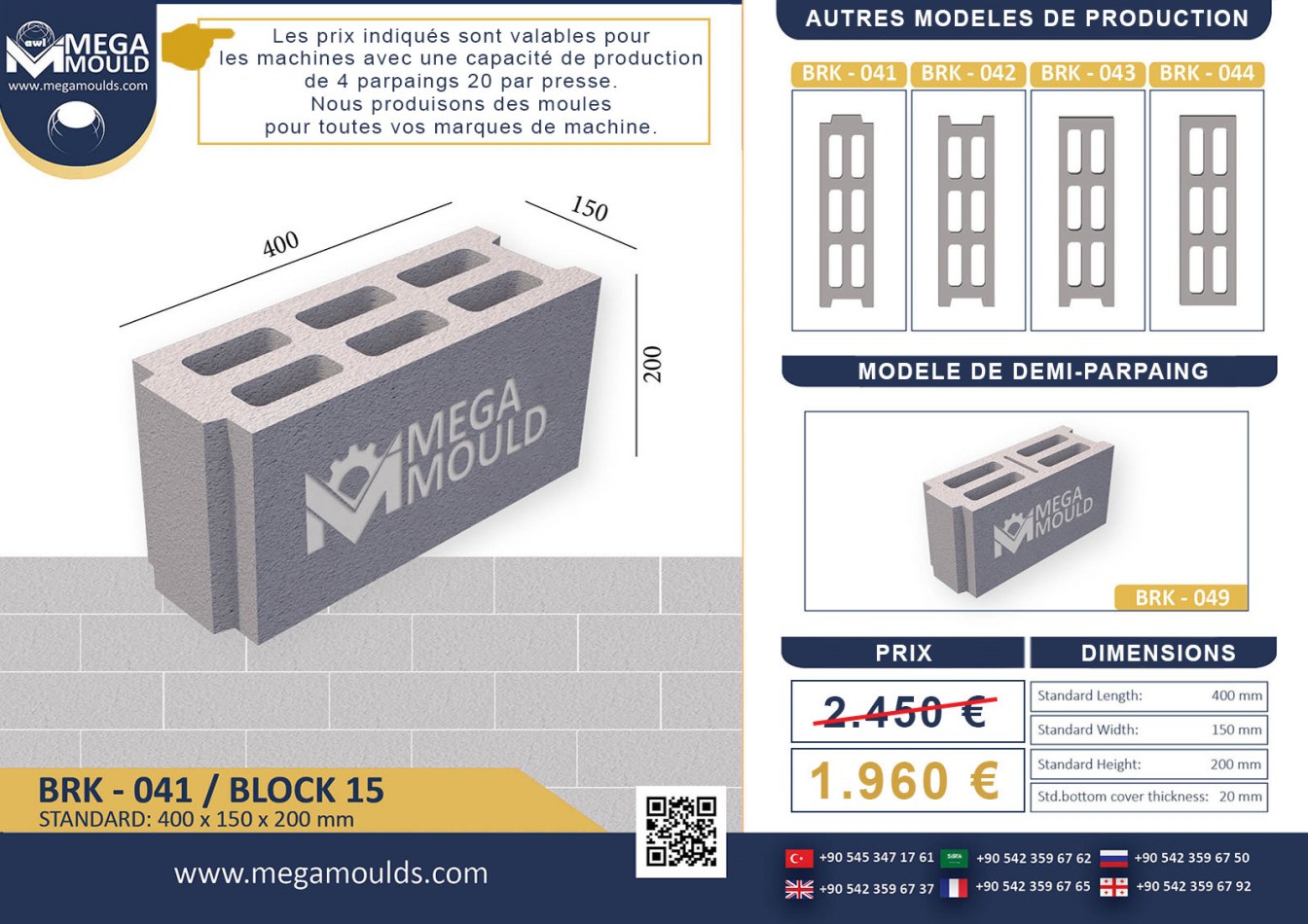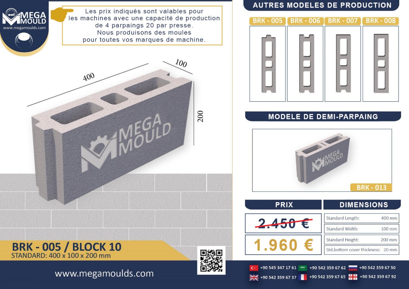 Les prix indiqués sont valables pour les machines qui produisent 4 parpaings 20 en une presse. Nous fabriquons pour toutes les marques et modèles de machines.