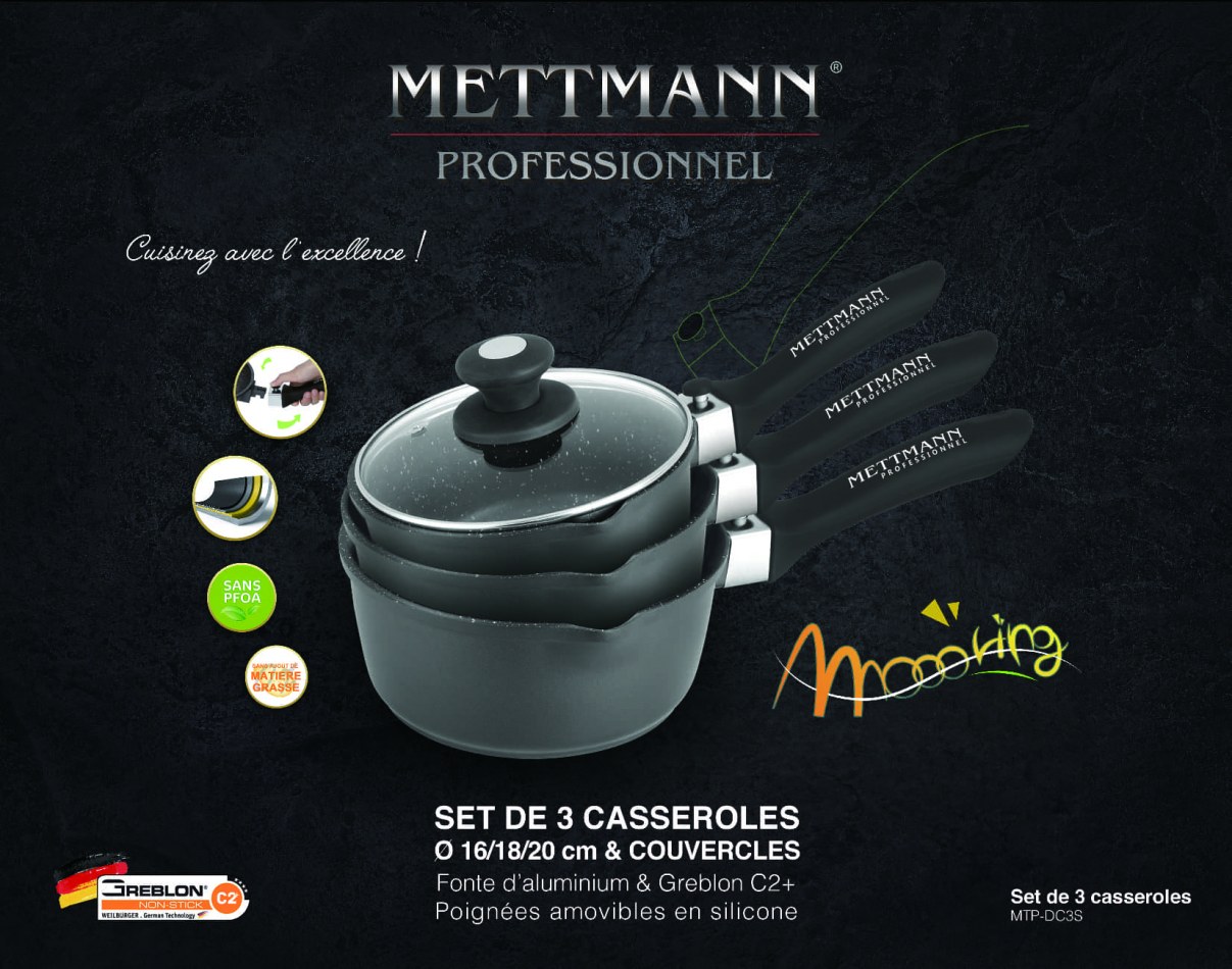 Cuisinez comme des pros avec ce Set de 3 casseroles manches amovibles 16/18/20 cm Mettmann Professionnel revêtement marbre
