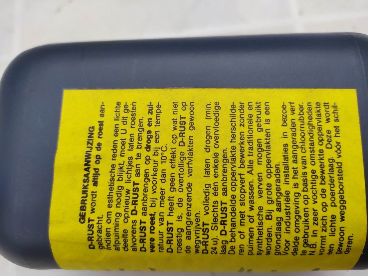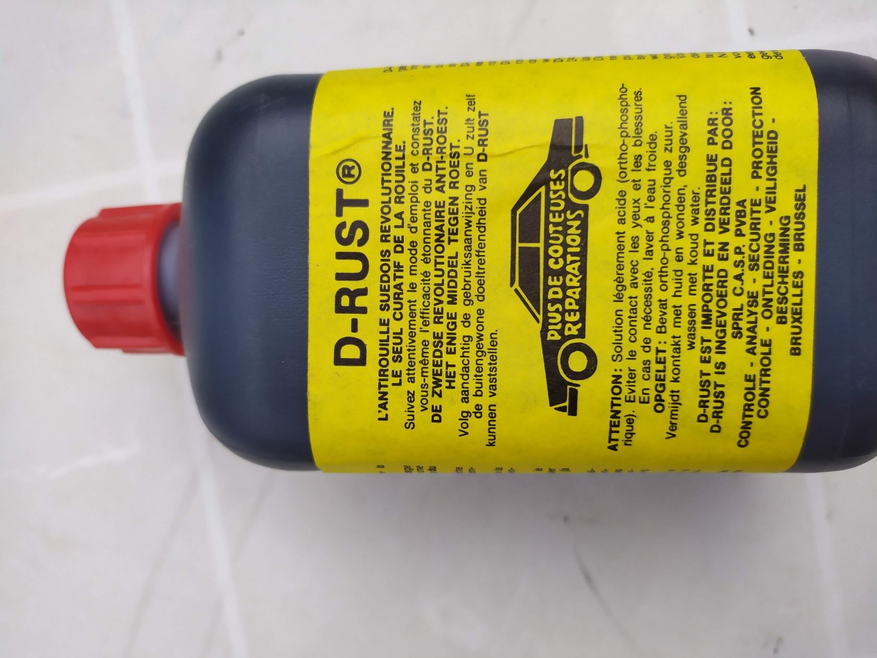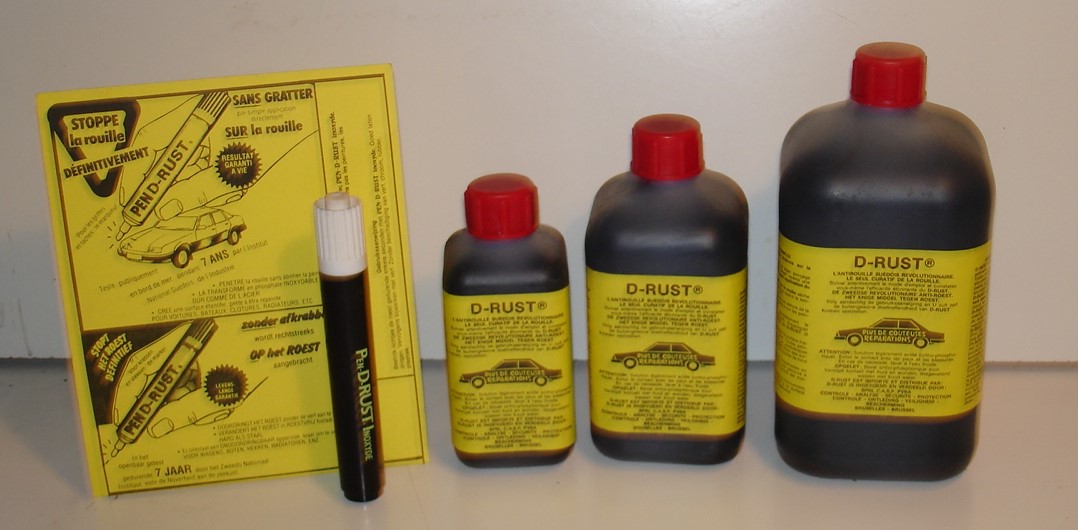 Stock de traitement antirouille à vendre. Produit suédois curatif définitif de la rouille. Agit par transformation de la rouille. S'applique directement sur la rouille. La surface traitée peut ensuite être peinte. Valeur marchande du stock potentiellement de 6 à 7 fois le prix demandé de 1654,50 €.