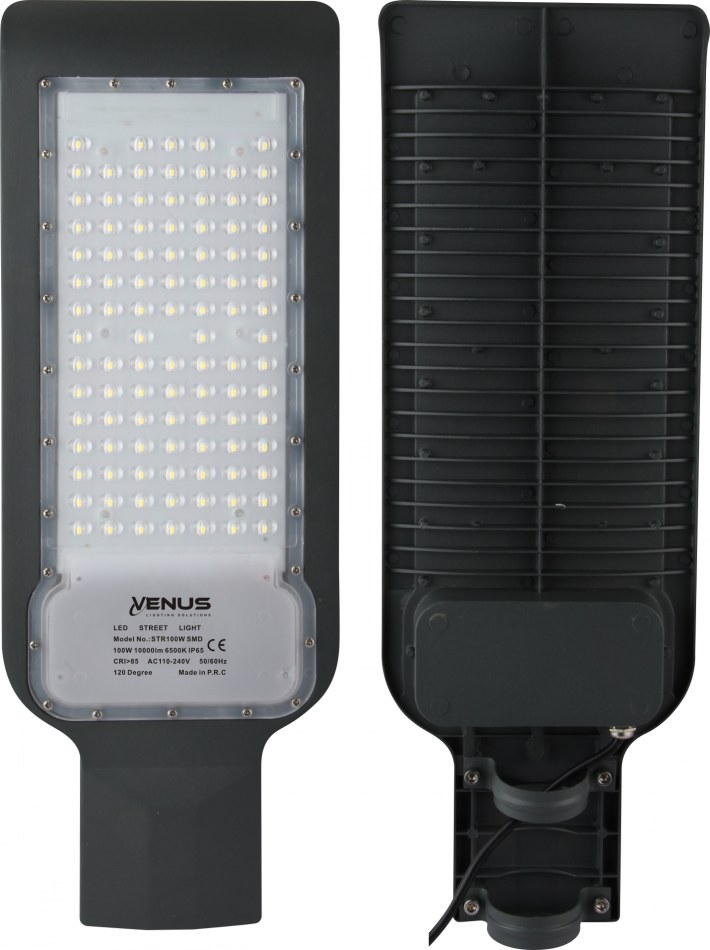 | Éclairage public 100W - SMD LED étanche IP65 - 6500K/blanc, Diamètre 525mm * 183mm * 52mm, SMD LED - tension 110-240V 50/60Hz, 10.000 Lumen, durée de vie 30000 heures, Diamètre de fixation : Ø50mm, Kit de montage non inclus, Angle de faisceau: 90 degrés avec lentille, Convient pour Intérieur et extérieur. |