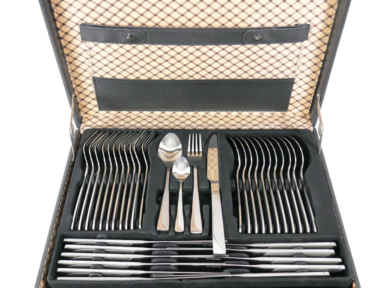Quantité : 72 pièces acier inoxydable ( inox 18/10 ) pour 12 personnes passe au lave-vaisselle. Composition :12 couteau – Fourche 12 , 12 fourchettes à dessert, 12 cuillères; 12 cuillères à café, 1 louche, 1 louche à sauce, 2 couverts à salade, 2 Fourchette à viande 1 cuillère à glace, 1 cuillère à sucre, 1 pince à sucre, 1 pelle à tarte, 2 cuillère de service