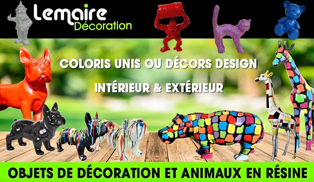 Depuis le Nord de la France nous bousculons le monde de la décoration en mettant à la portée de tous, des statues, des animaux à la fois design, originaux et réalistes. ( chiens , chats , lapins , poules , coqs , vaches , moutons , cochons , oiseaux , chèvres , chevaux , anes , girafes , elephants , lions , tigres , pantheres , jaguar , singes , gorilles , hippopotames , rhinoceros , kangourous , koalas , pandas, zebres , autruches , chameau , crocodiles , pingouins , araignees , iguanes , serpents , tortues , ours , canards , escargots, poissons , requins , dinosaures , nains de jardins , trophees , bouddhas , cranes , squelettes , horeca , indiens , fruits et légumes etc ... .