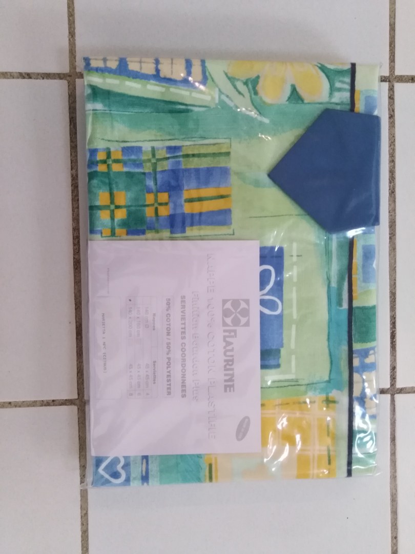 lot de 100 nappes en tissu coton plastifié, dimensions 140 x 200 + 8 serviettes unis coordonnées, dans une pochette plastique transparente.Entretien très facile, idéale extérieur.