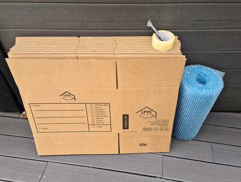 Rouleaux de papier bulle, Cartons de déménagement, cartons pour assiettes , verres.