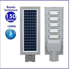 Cette lampe de rue solaire 150W est parfait pour l'éclairage public en particulier les voies qui ne sont pas desservies par le réseau électrique. Le luminaire est doté d'un détecteur de mouvement et de crépuscule. Il fonctionne en toute autonomie grâce à son panneau solaire et n'a donc pas besoin d'être raccordé au secteur.