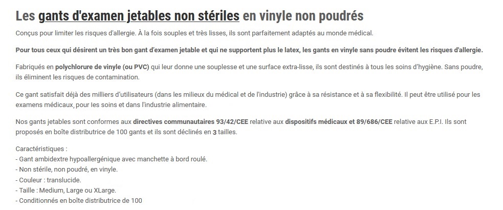 Cette page concerne les Fournisseurs et Grossistes de GANT D'EXAMEN VINYLE NON POUDRE NON STERILE TAILLE M/ L / XL Rechercher dans la catégorie : Médical Rechercher dans la catégorie : taille, poudre, sterile, examen, gant, vinyle |