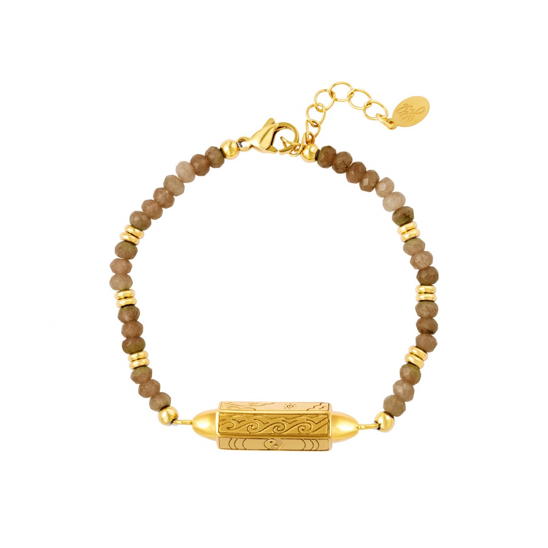 Bracelet avec des petites perles marrons/dorées et un insert à motif sur le dessus (signe : le yin et le yang)