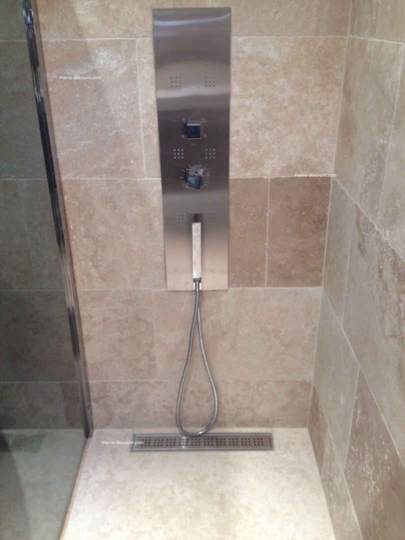 Nous avons plusieurs dimensions en Stock mais nous vous proposons aussi du sur mesure, pour s'adapter à vos critères. Nous pouvons décliner aussi chaque pièce souhaitée en couleur différente. Aussi pour un même receveur de douche en travertin , nous avons une gamme de couleur du beige au gris , plus au moins nuancé.