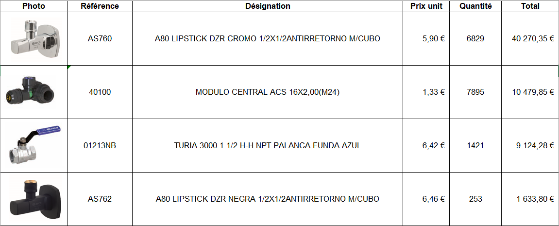 Nous sommes spécialisé dans le déstockage à l'export dans le domaine de la construction et du bricolage. En exclusivité, nous vous proposons un lot de la marque Espagnole Arco de 224 557 pièces. - Vente à l'export uniquement (Afrique ou Moyen-Orient) - Paiement comptant avant enlèvement. - Minimum de commande : 10 000 euros. Contactez nous pour plus de renseignements, nous sommes très réactifs.
