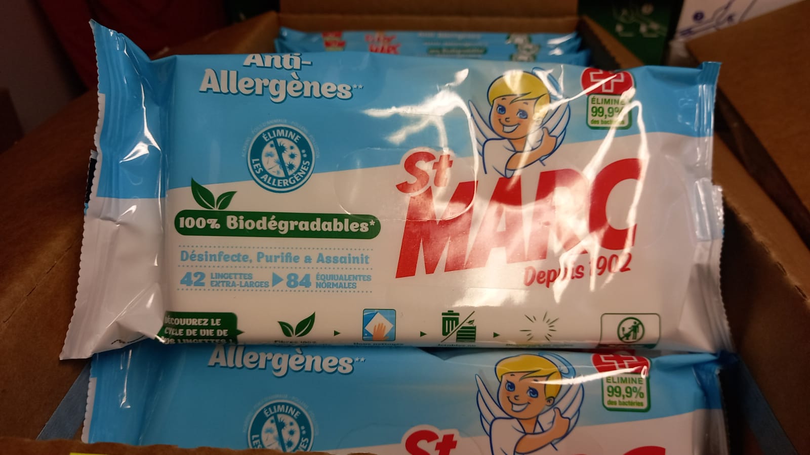 Lot de lingette Saint Marc Anti-allergène Conditionnement carton de 16 paquets de 42 lingette extra large Prix 9 euros/ carton Quantité minimum d'achat 100