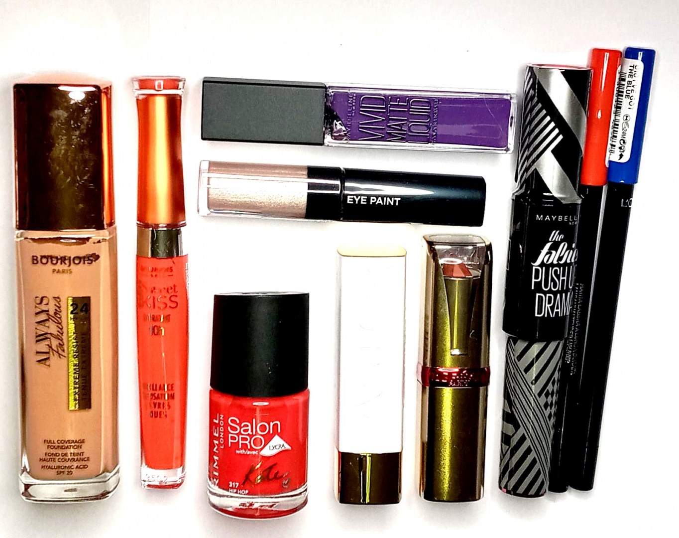 Assortiments composés par nos soins , nous melangeons des rouges a levres, des gloss, crayons de contours, bases contouring, palettes, blushs, fonds de teint, correcteurs, mascaras, eyeliners, khôls, fards a paupieres et des vernis a ongles. bien variés en coloris