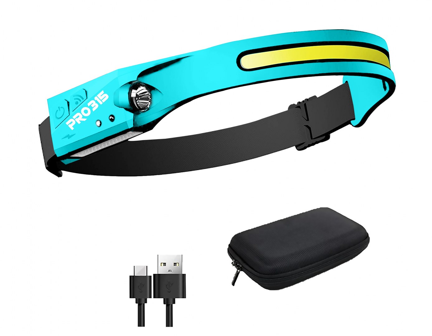 Lot lampe frontale led rechargeable par cable type C (inclu) puissante avec mode capteur de mouvement et étuit de rangement. 150 CYAN, 150 gris , 100 rouge