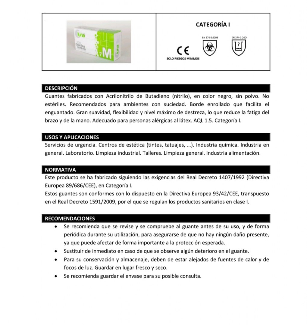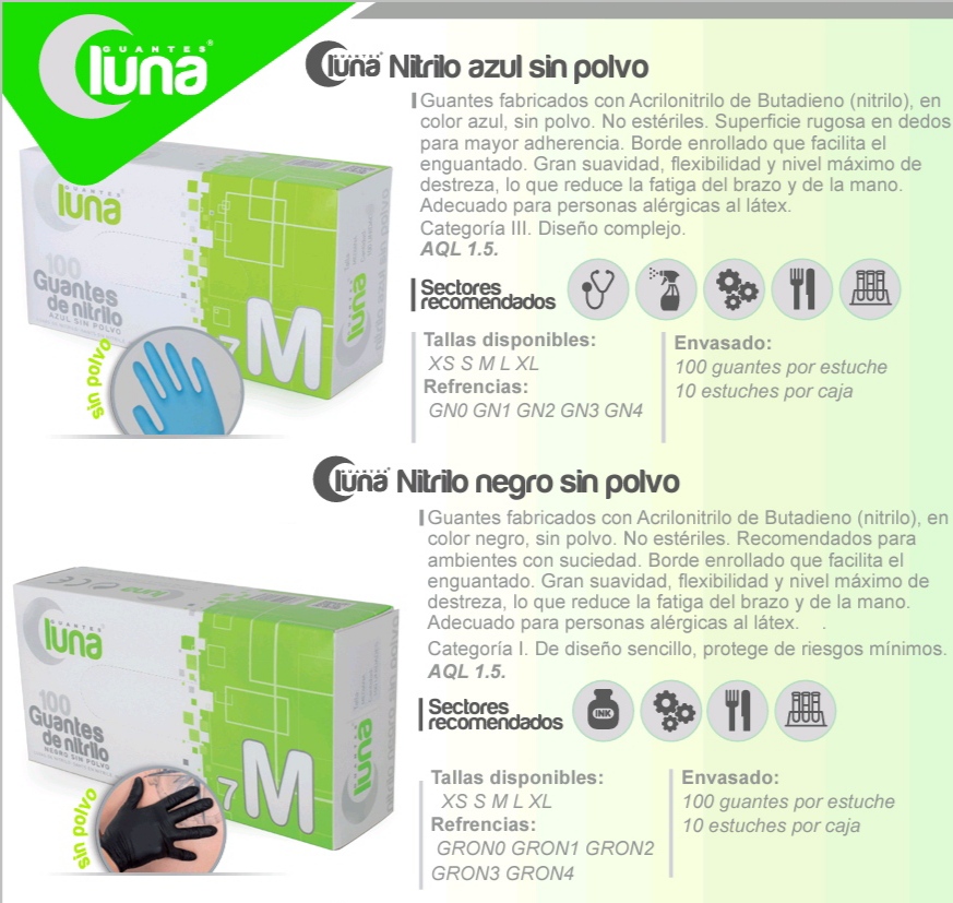 Vente de pallette de gants nitrile de haute qualité super résistant et de couleurs noir bleu blanc tailles S. M. L. XL. Nous sommes fabriquant en ESPAGNE.