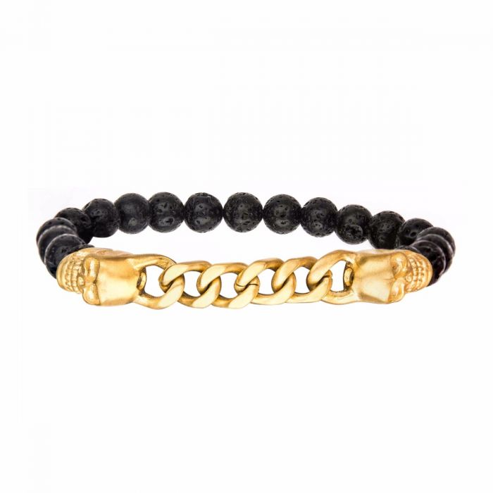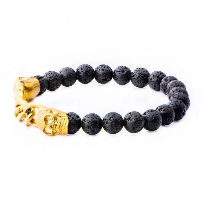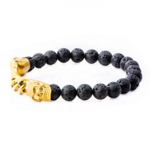 BRACELET HOMME TÊTE DE MORT OR AVEC CHAÎNE, PERLES DE LAVE NOIRE BR3301K