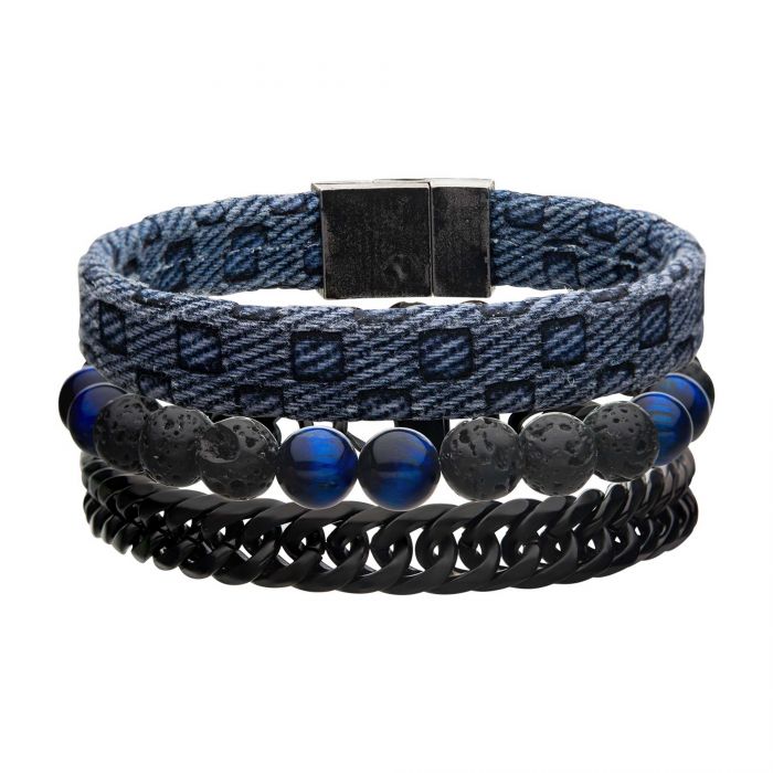 BRACELET HOMME PIERRES ŒIL DE FAUCON, PIERRES DE LAVE, ACIER ET JEANS AMERICAIN BR...