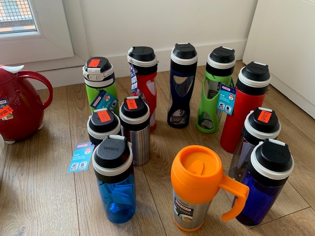 Mise en vente d'un lot de GOURDES est des thermos multicouleurs est aussi de differente matières en verre , plastique et en alluminium