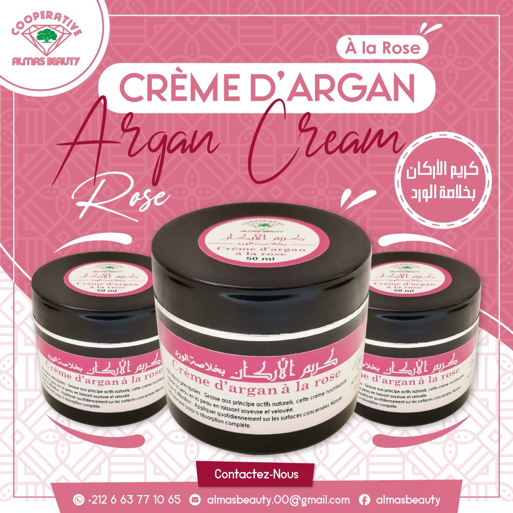 Le crème d'argan à la rose est très riche en acide gras essentielle et en vitamine (E) l'huile d'argan et appréciée pour ces propriétés hydratant, revitalisent et antirides .L'huile d'argan lisse, repeuple et adoucie l'épiderme et prévienne du vieillissement cutané.