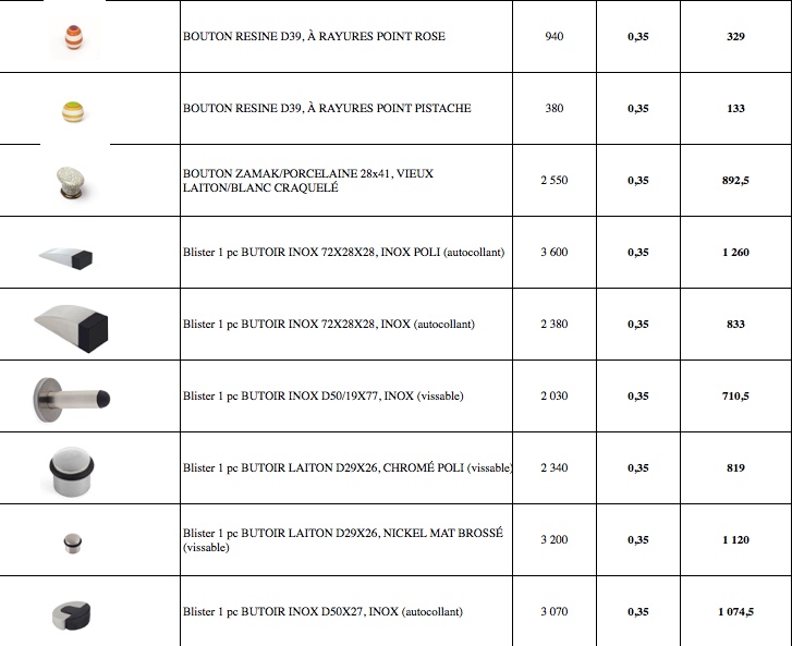 Nous sommes spécialisés dans le déstockage à l'export dans le domaine de la construction et du bricolage. En exclusivité, nous vous proposons un lot de 111 820 pièces de poignées et boutons de portes.