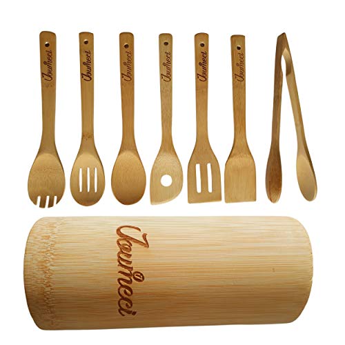 Ensemble de 7 ustensiles de cuisine avec support de rangement en bambou, accessoires de 30 cm en bambou écoligique, biodegradable, respectueux de l'environement, resitant à la chaleur.