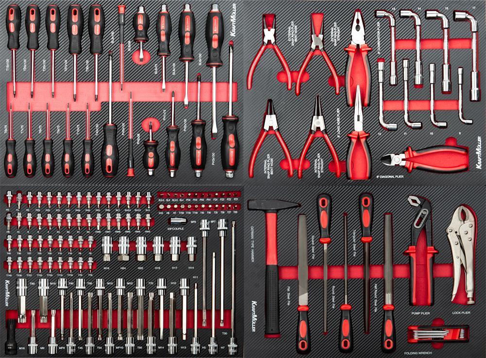 et sont équipés de façon unique de rochets, douilles, jeux d'embouts, pinces, clés plates, marteaux, pinces, etc.