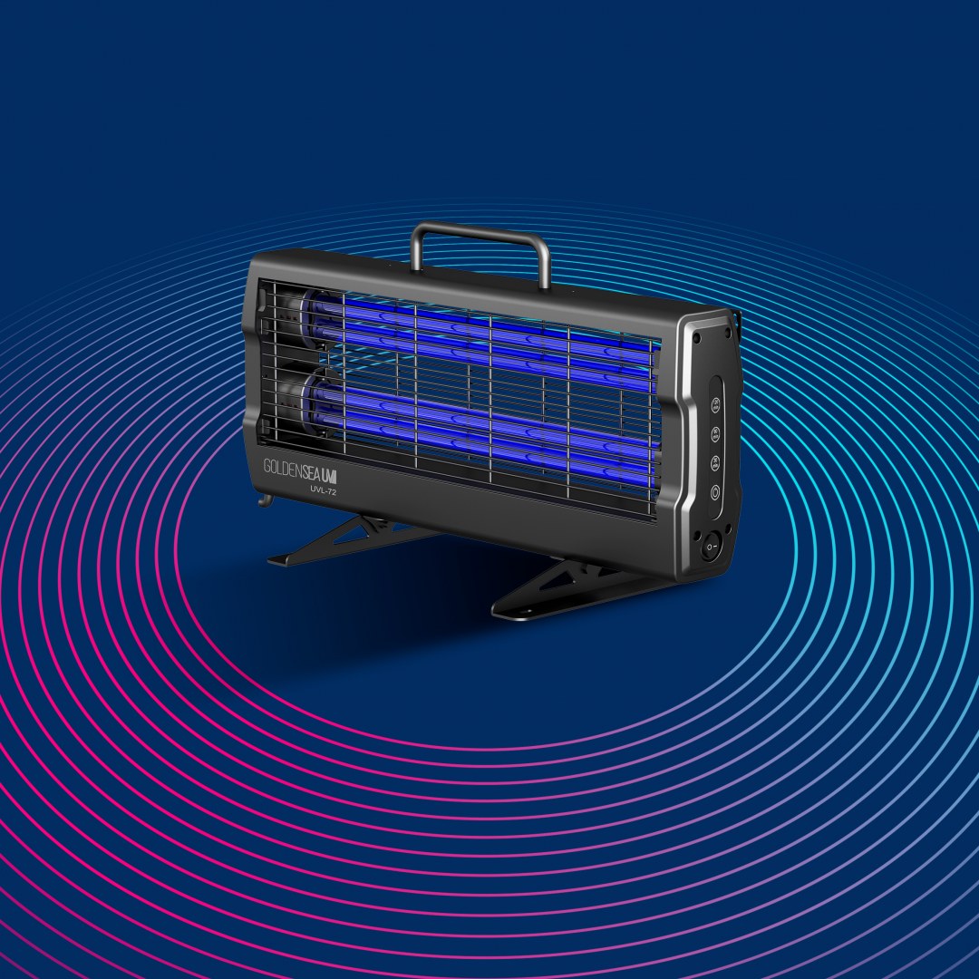 Surface disinfection unit. Inactivates viruses, bacteriae, molds using UV-C light. CE, ISo certified. Motion detection, remote control. 3 pre-defined durations. 20 up to 80m².