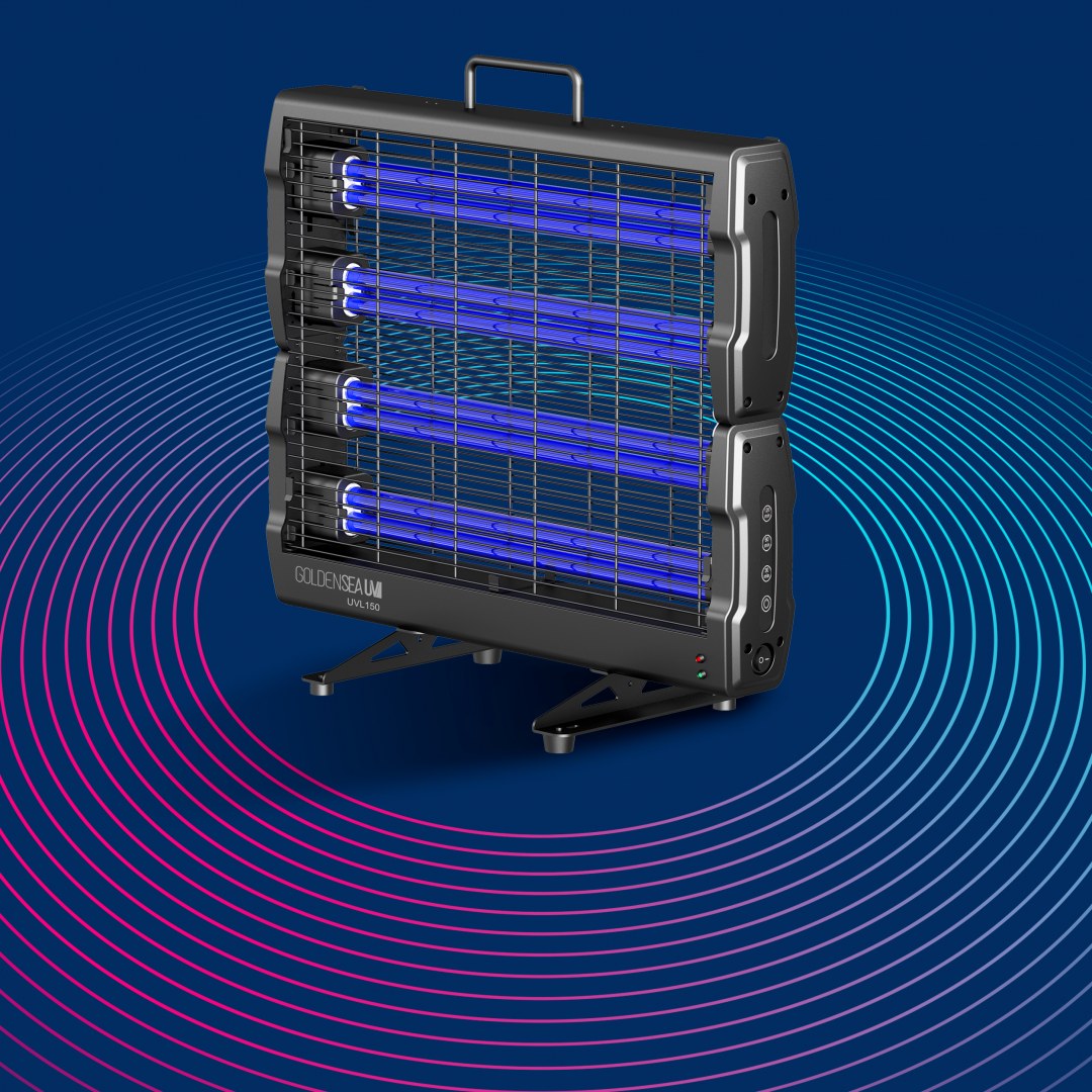 Surface disinfection unit. Inactivates viruses, bacteriae, molds using UV-C light. CE, ISo certified. Motion detection, remote control. 3 pre-defined durations. 40 up to 160m².