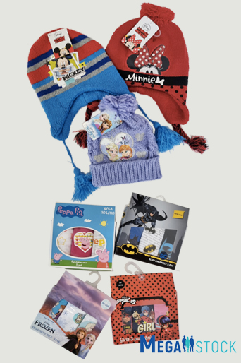 Le lot contient des bonnets, des écharpes, des gants, des shorts, des T-shirts, des chapeaux, des chaussons, des épingles à cheveux, des portefeuilles et d'autres accessoires pour enfants de différents modèles et couleurs, décorés d'images de personnages de dessins animés favoris ou d'autres dessins d'enfants.