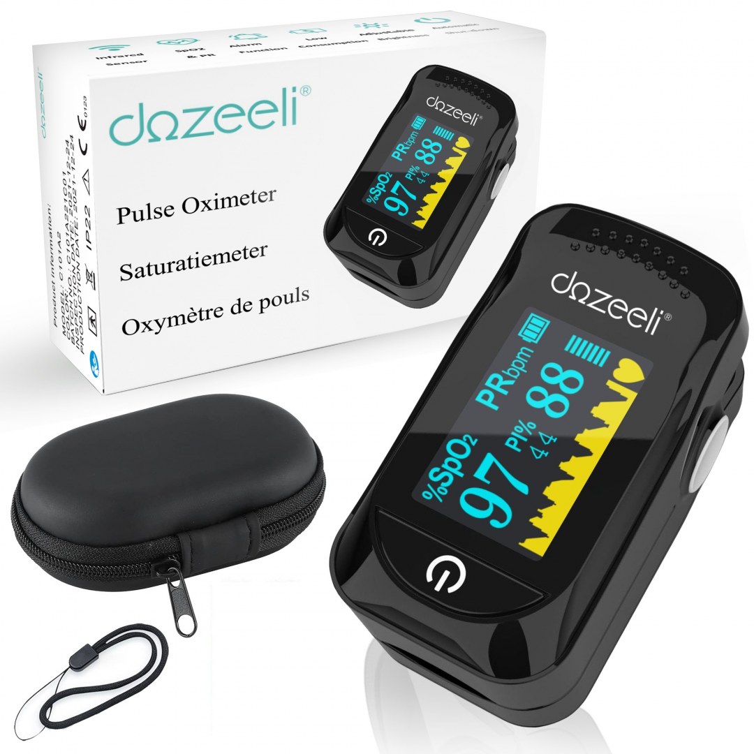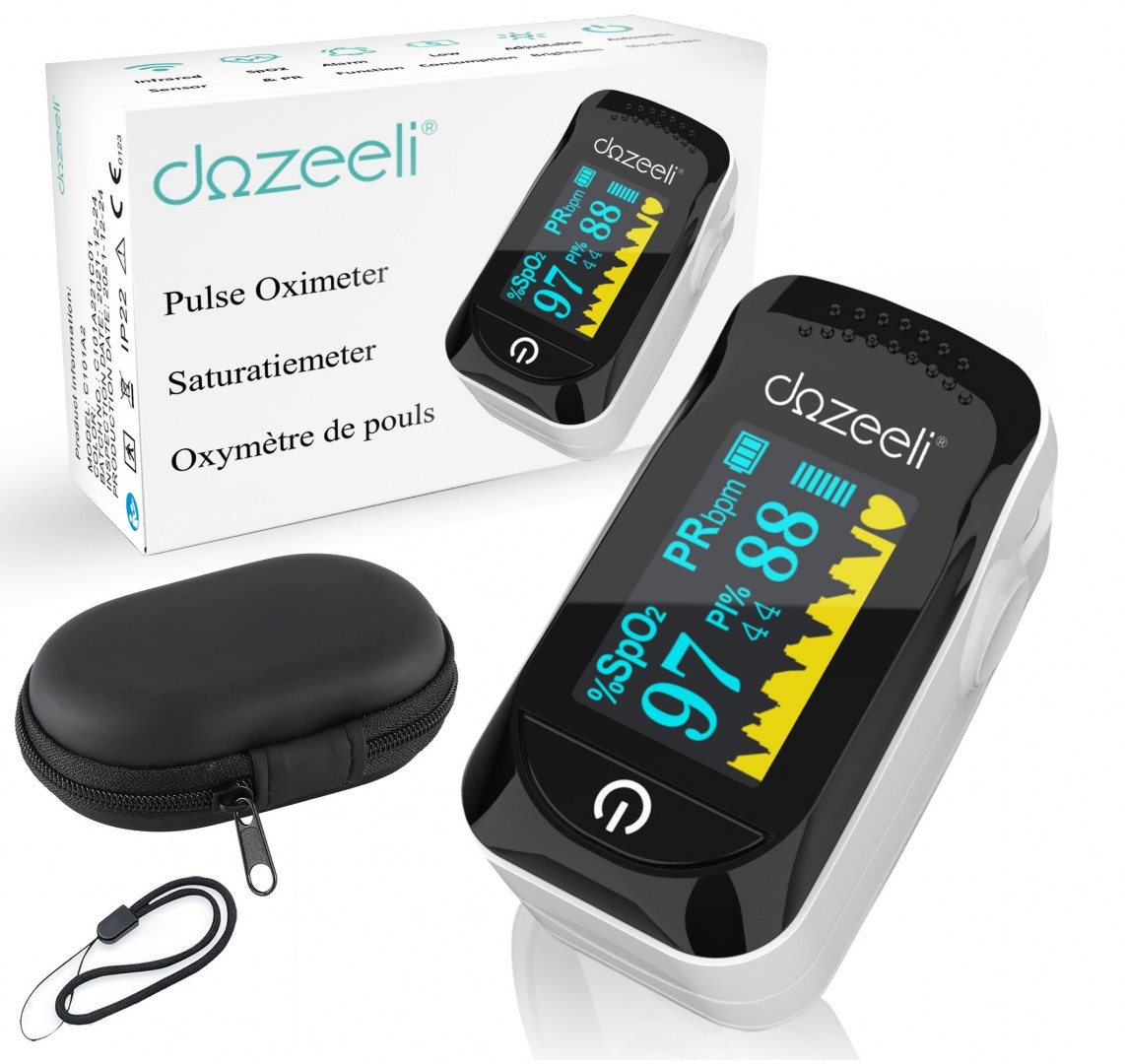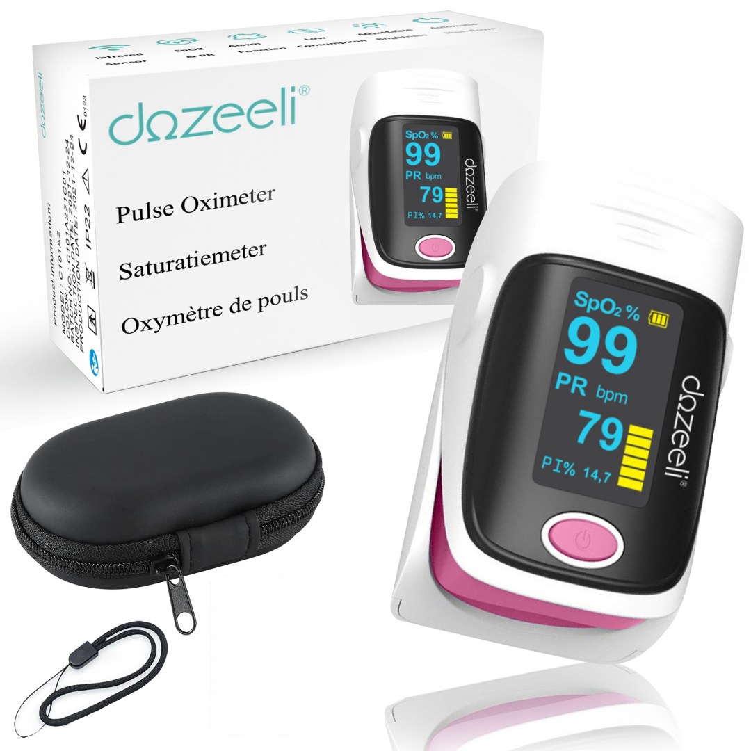 Lot d'oxymètre de doigt disponible en plusieurs coloris + housse de rangement et lanière. Les oxymètres ont été enregistrés à l'agence fédéral des médicaments et produits de santé Belge (AFMPS).
