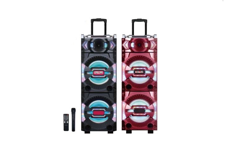 Système de sono portable et autonome de chez KRAFTMULLER avec effets lumineux à LED intégrés sur les Boomers.